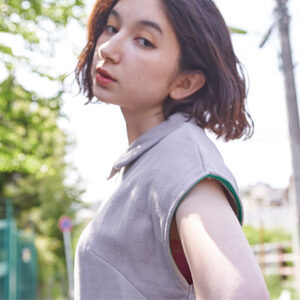 ブルーグレーは肌の色と上手く馴染み、明るくキレイに見せてくれるから、お気に入り。優しいベージュの上品な印象のジレを重ねると、ちょっとこだわったオフィススタイルに。こんな淡いグラデーションのスタイリングの日は、ホワイトのきれいめなリュックとパンプスで、さらに明るいトーンでフェミニンに仕上げるのが好き。